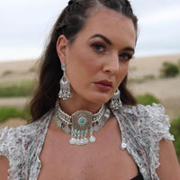 • Our Tara Boho Statement Choker is a flirty bohemian style choker that showcases a vintage, ethnic vibe. It features an intricately designed metal band with coin charms. This choker will be the perfect adornment for your festival-worthy outfits.